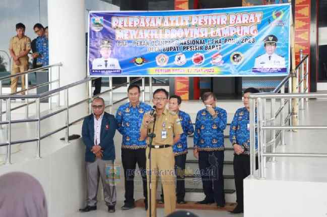 Grahapost.com Pesisir Barat – Bupati Pesisir Barat (Pesibar) Agus Istiqlal dengan didampingi oleh Wakil Bupati (Wabup) Pesibar, A. Zulqoini Syarif, Kepala Dinas Pemuda dan Olahraga (Dispora), Eksir Abadi dan jajaran pengurus Komite Olahraga Nasional Indonesia (KONI) Pesibar, melepas 15 atlet yang akan mengikuti Pra Pekan Olahraga Nasional (Pra-PON) Tahun 2023, di Halaman Sekretariat Komplek Perkantoran Pemkab Pesibar, Senin (17/7/2023).