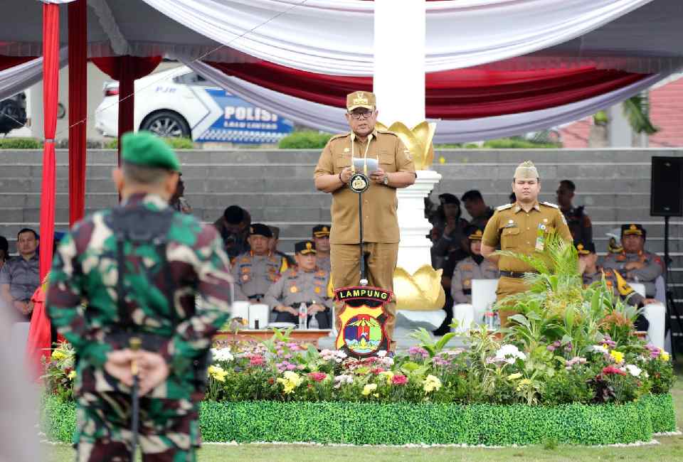 Grahapost Bandar Lampung – Gubernur Lampung Arinal Djunaidi menyampaikan 8 (delapan) hal penting terkait Kesiapan Pemilu 2024 dan Siaga Bencana di Wilayah Provinsi Lampung saat menjadi pembina dalam Apel TNI- Polri, di Lapangan Korpri, Komplek Kantor Gubernur, Bandar Lampung, Selasa (6/2/2024).