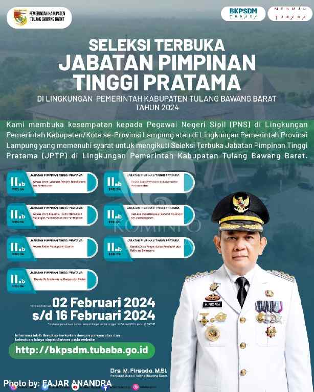 Grahapost Tubaba – Penjabat (Pj) Bupati Tulang Bawang Barat (Tubaba) Drs. M. Firsada, M.Si. menyatakan Pemerintah Kabupaten (Pemkab) Tubaba telah membuka pengumuman seleksi terbuka pengisian 7 (tujuh) Kepala Organisasi Perangkat Daerah (OPD) atau Jabatan Pimpinan Tinggi Pratama (JPTP) yang dimulai 2-16 Februari 2024.