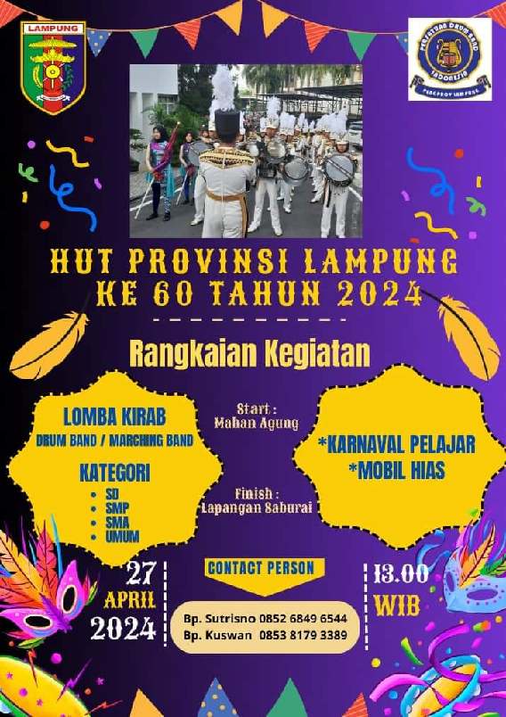 Pemerintah Provinsi Lampung juga mengajak seluruh masyarakat Lampung untuk turut serta menyaksikan dan meramaikan pawai Drumband dan Mobil Hias yang akan melewati rute – rute yang telah ditentukan. (*)