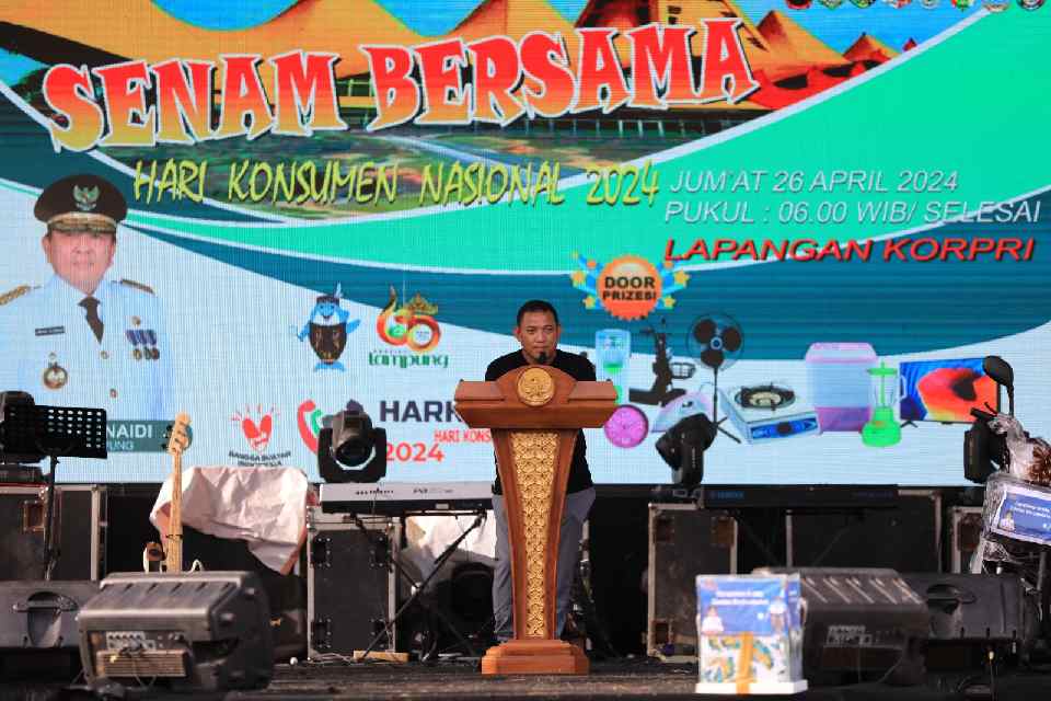 Grahapost Lampung – Sekretaris Daerah Provinsi Lampung Fahrizal Darminto, mewakili Gubernur Lampung Arinal Djunaidi, membuka Peringatan Hari Konsumen Nasional (Harkonas) dan Bazar Usaha Mikro Kecil Menengah (UMKM), sekaligus merayakan Hari Jadi Provinsi Lampung ke-60 dengan dimeriahkan senam bersama di Lapangan Kopri, Komplek Dinas Kantor Gubernur, Jum’at (26/4/2024).