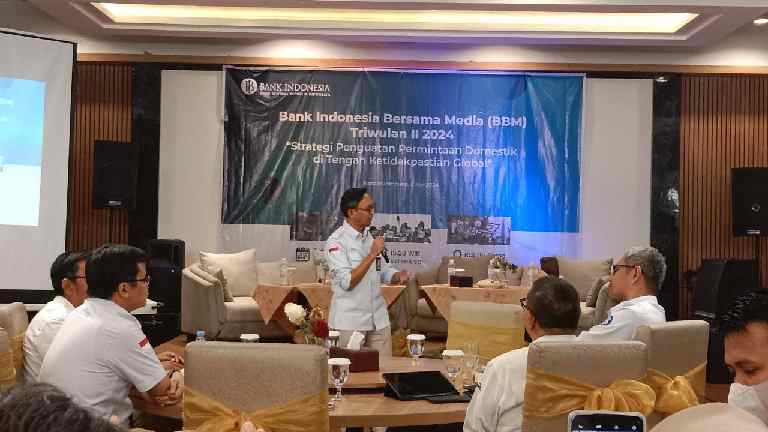 Grahapost Bandar Lampung – Bank Indonesia (BI) Perwakilan Provinsi Lampung menggelar acara Bank Indonesia Bersama Media (BBM) Triwulan II 2024, Kegiatan yang mengusung tema, Strategi Penguatan Permintaan Domestik di Tengah Ketidakpastian Global, diikuti ratusan awak media. di Hotel Bukit Randu, Rabu (8/5/2024).