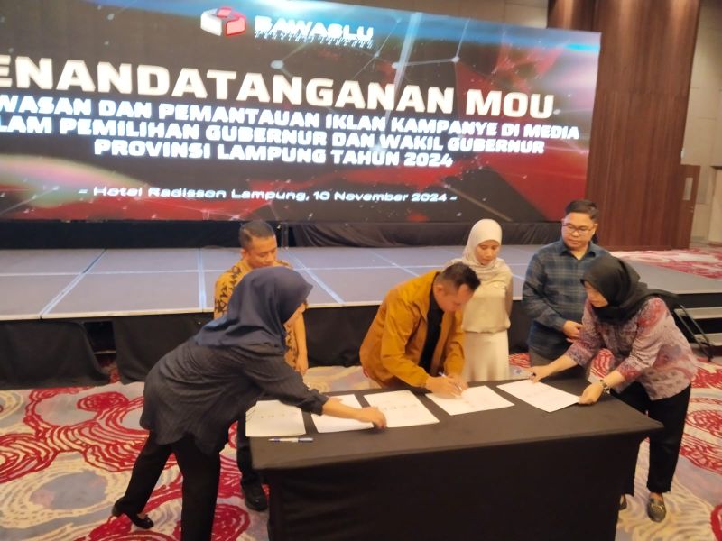 Grahapost Bandar Lampung – Bawaslu Provinsi Lampung bersama tiga lembaga lainnya, yaitu Komisi Pemilihan Umum (KPU) Provinsi Lampung, Komisi Penyiaran Indonesia Daerah (KPID) Provinsi Lampung, dan Komisi Informasi (KI) Provinsi Lampung, menandatangani Surat Keputusan Bersama (SKB) tentang Pembentukan Gugus Tugas Pengawasan dan Pemantauan Pemberitaan, Penyiaran dan Iklan Kampanye dalam Pemilihan Gubernur, Bupati dan Wali Kota 2024 di Lampung, Minggu (10/11/2024).