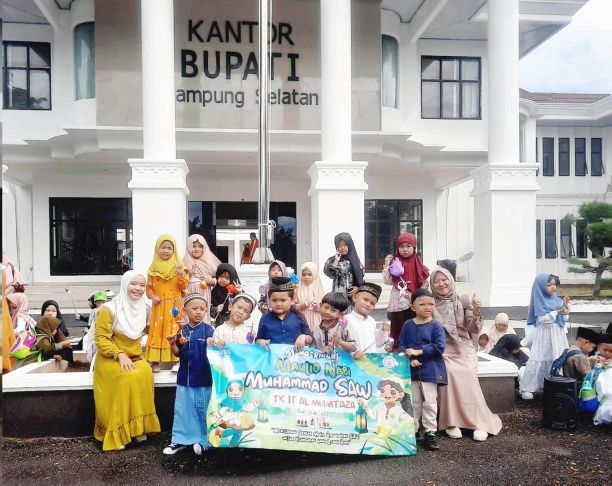 Puluhan anak-anak TK IT Al Mumtaza dengan busana muslim penuh warna berjalan beriringan sambil membawa kembang telur. Mereka tampak antusias mengikuti kegiatan belajar luar kelas yang dipadukan dengan peringatan Maulid Nabi Muhammad SAW 1447 H.